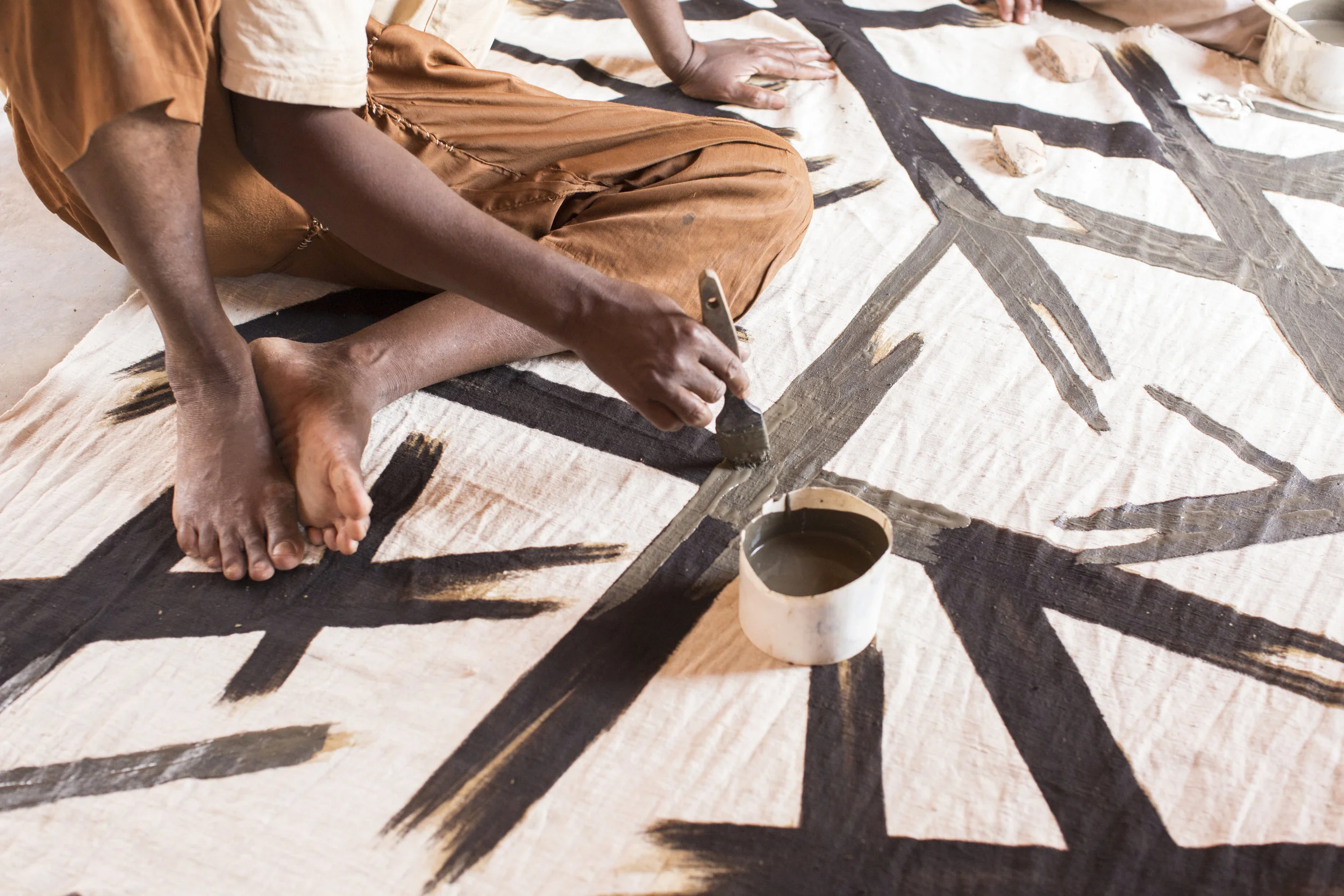 Another traditional West African cloth is bogolanfani, the so-called “mud cloth” from Mali. Made by the Bamana women to the north of the Bamako region. The cloth is made out of Basilan cotton fabric dyed with fermented mud. The abstract design is painted on with a darker shade of fermented mud. Bogolanfini is a living art form with techniques and motifs passed down from generations of mothers to daughters; each piece of mudcloth tells a story. No two pieces are alike and each pattern and color combination has a meaning.
